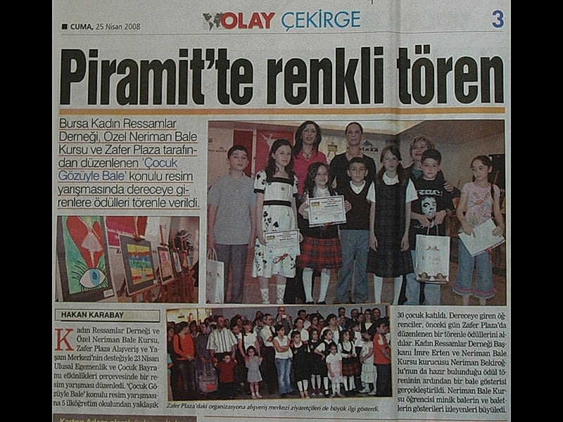 Piramit’te renkli tören Bursa Kadın Ressamlar Derneği ,Özel Neriman Bale Kursu ve Zafer Plaza tarafından düzenlenen ‘Çocuk Gözüyle Bale’ resim yarışmasında dereceye girenlere ödülleri törenle verildi.