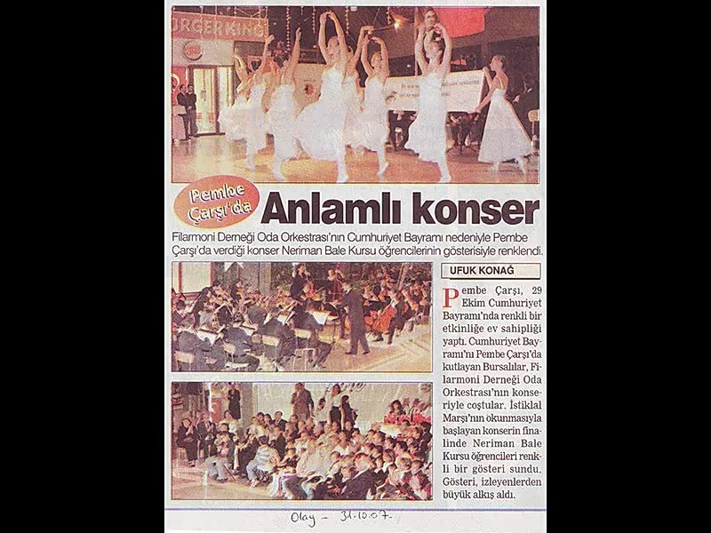 Anlamlı Konser Flarmoni Derneği Oda Orkestrasının Cumhuriyet Bayramı nedeni ile Pembe Çarşıda verdiği konser Neriman Bale Kursu öğrencilerinin gösterileri ile renklendi.