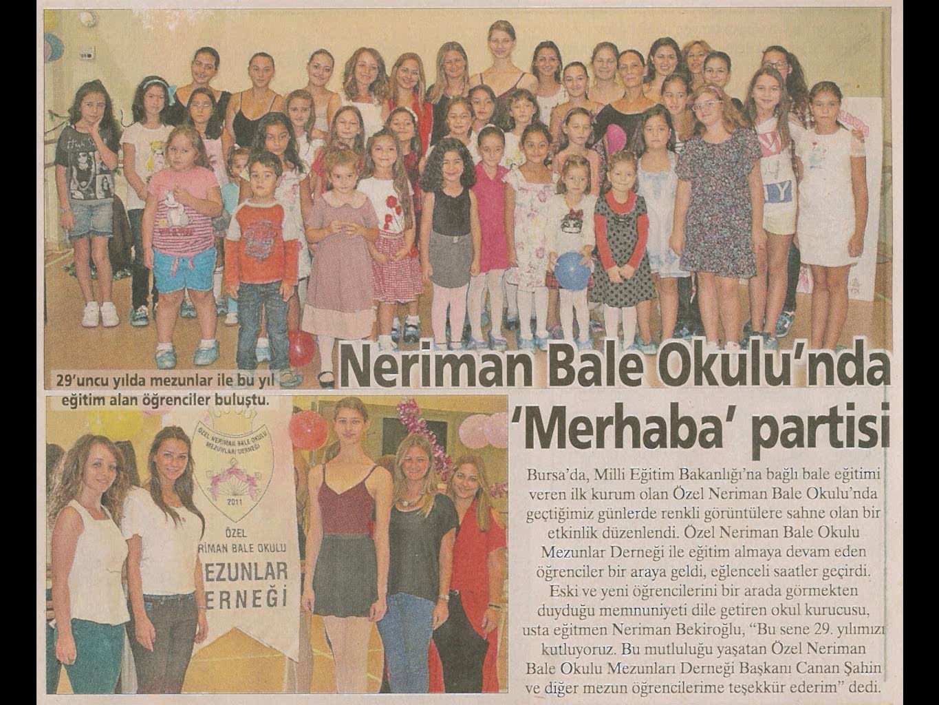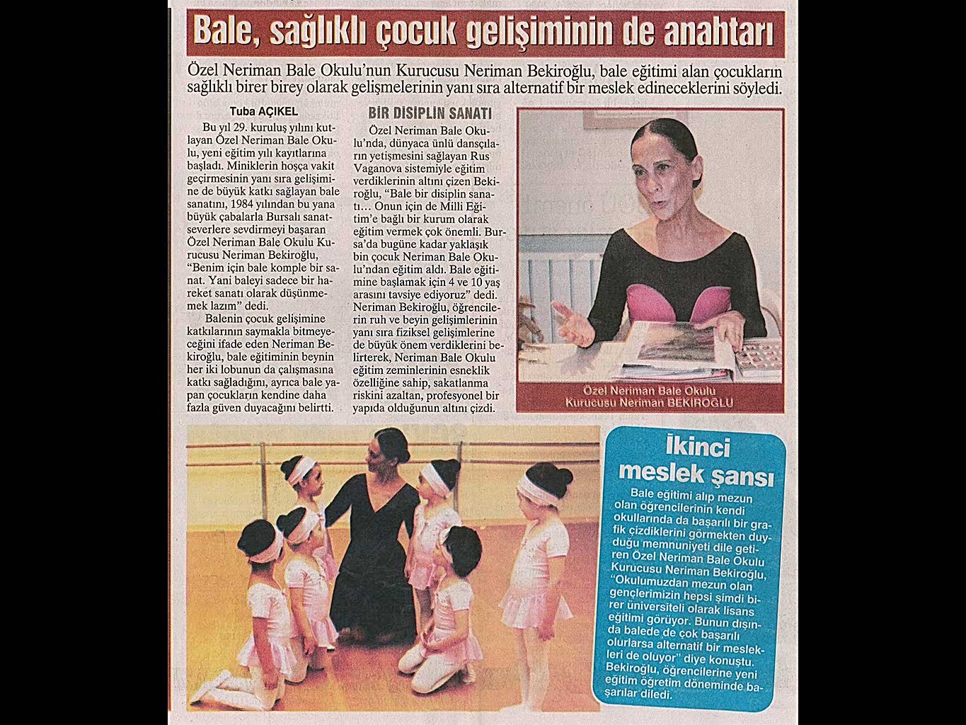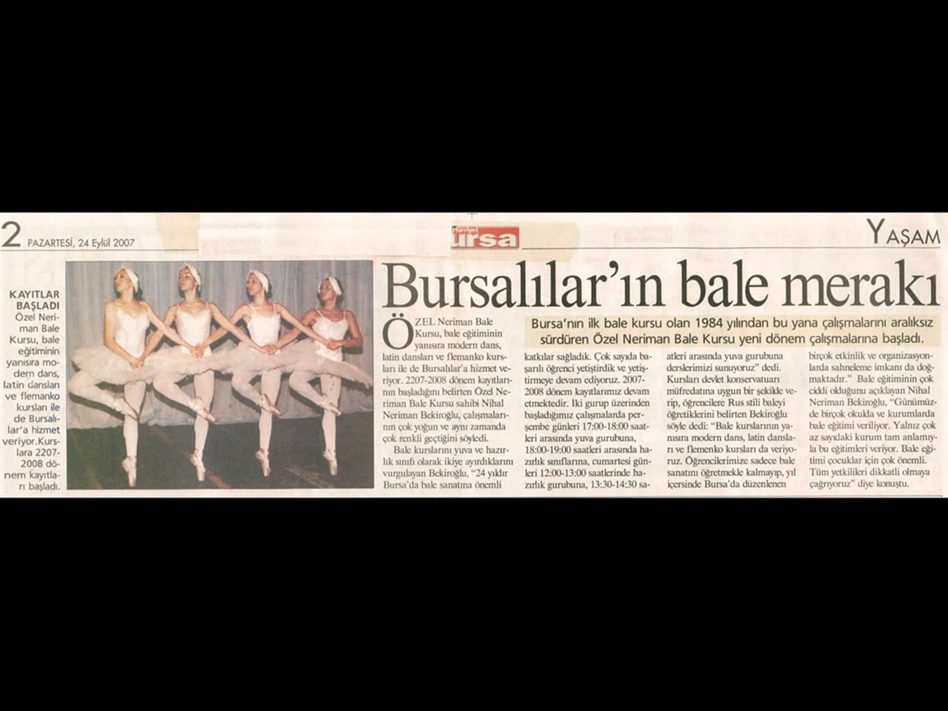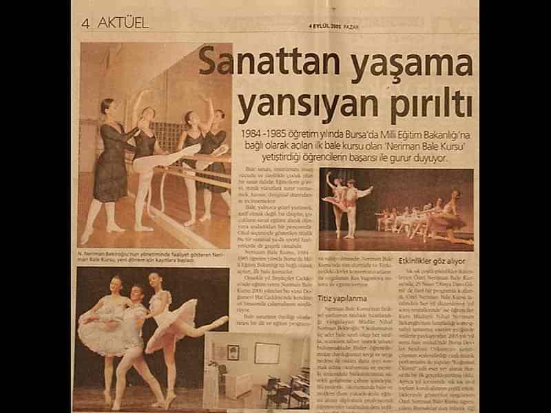 Sanatın ışıklarından, yaşama yansıyan bir pırıltı ‘Bale’… 1984-1985 öğretim yılında Bursa’da Milli Eğitim Bakanlığı’na bağlı olarak açılan ilk bale kursu olan ‘Neriman Bale Kursu’ yetiştirdiği öğrencilerin başarısı ile gurur duyuyor