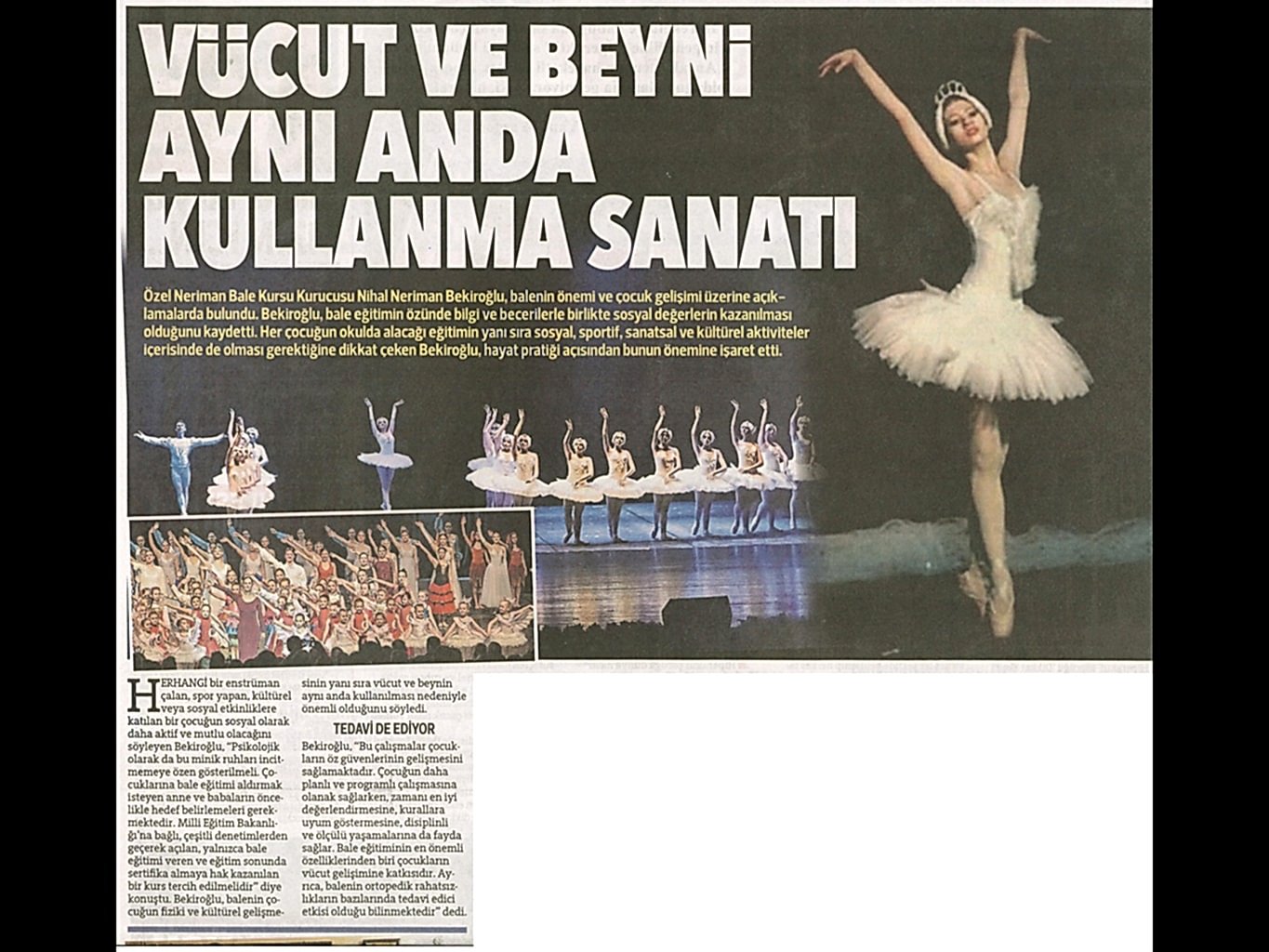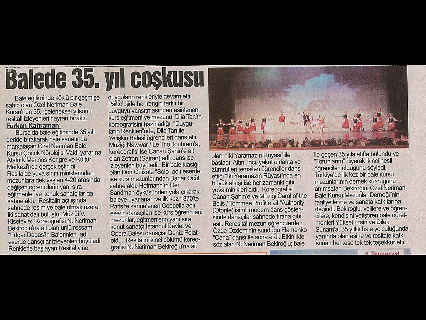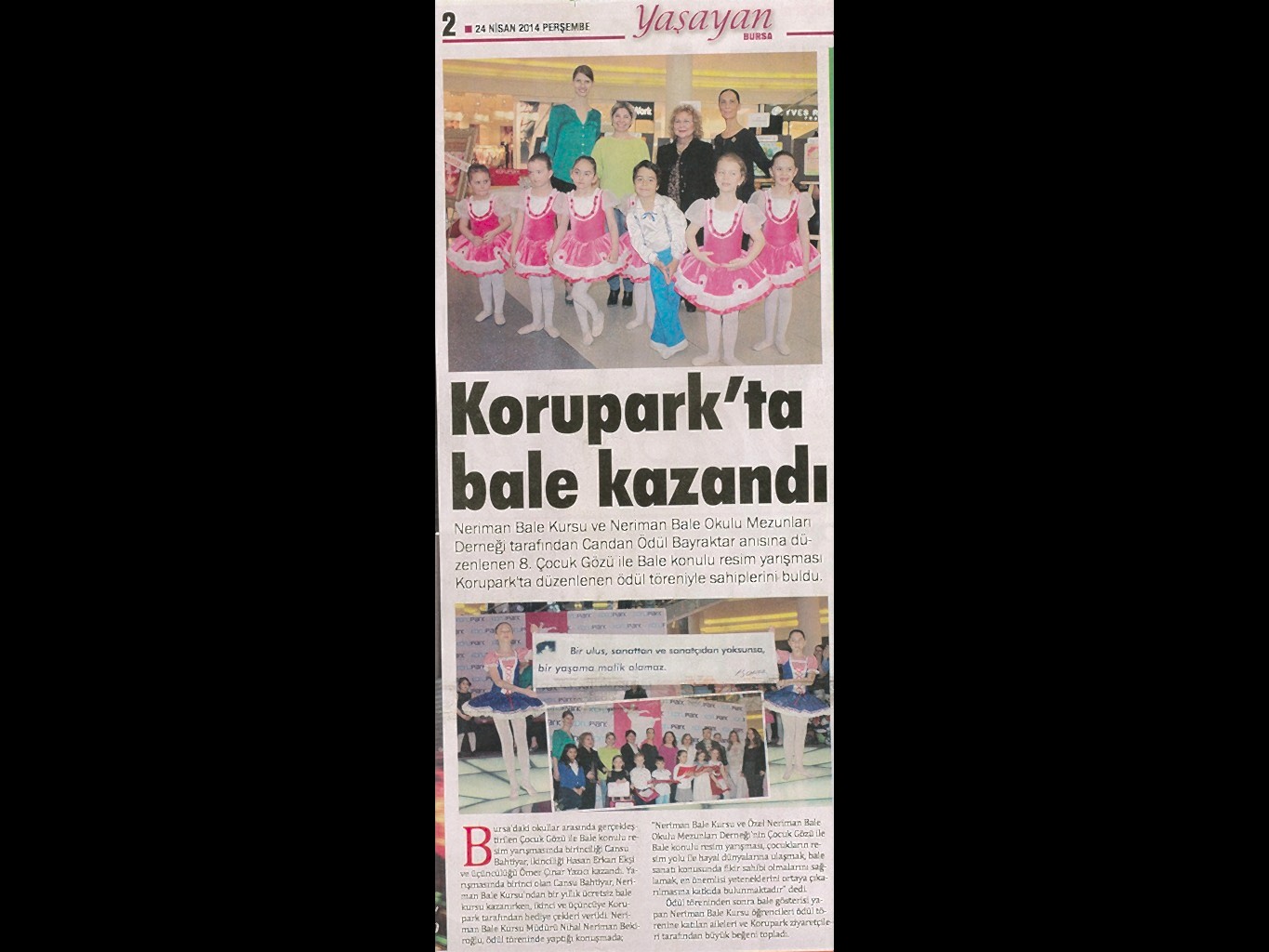 Sanatın ışıklarından, yaşama yansıyan bir pırıltı ‘Bale’… 1984-1985 öğretim yılında Bursa’da Milli Eğitim Bakanlığı’na bağlı olarak açılan ilk bale kursu olan ‘Neriman Bale Kursu’ yetiştirdiği öğrencilerin başarısı ile gurur duyuyor