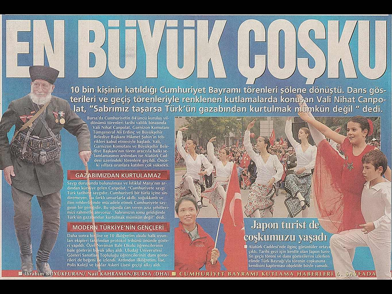En Büyük Coşku 10 bin kişinin katıldığı Cumhuriyet törenleri şölene dönüştü.Dans gösterileri ve geçiş törenleri ile renklenen kutlamalarda konuşan Vali Nihat Canpolat “Sabrımız taşarsa Türk’ün gazabından kurtulmak mümkün değil” dedi.